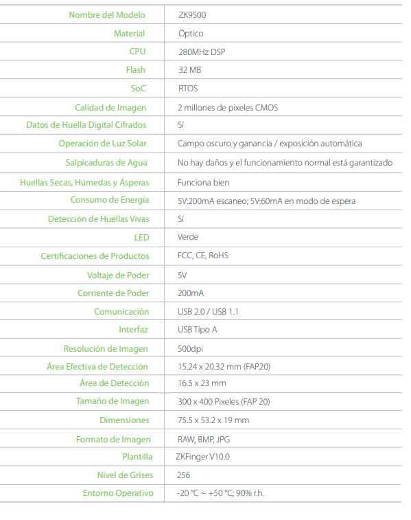 ZK9500, es el último escáner óptico de huellas digitales, desarrollado por ZKTeco. El escáner realiza la detección de dedos y captura la imágen de la huella digital rápidamente y con alta resolución.