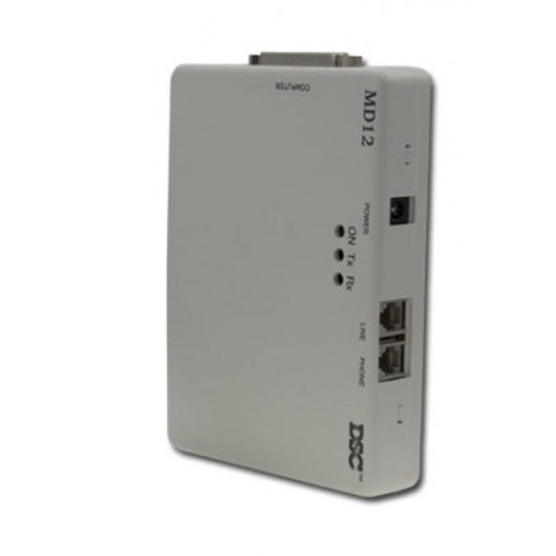 El MD-12-25-25P se incluye en el modelo moderno antes de los paneles de intrusión DSC. El módem de acceso telefónico está equipado con una línea y una conexión telefónica para conectar el módem a la línea fija analógica / PSTN. También hay 3 LED que indican el estado del módem. De esta forma puede ver si hay una transmisión de datos en curso.