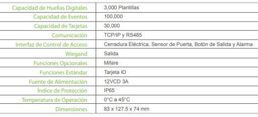 | Tecnología | Tarjeta / Código / Huella BioID |